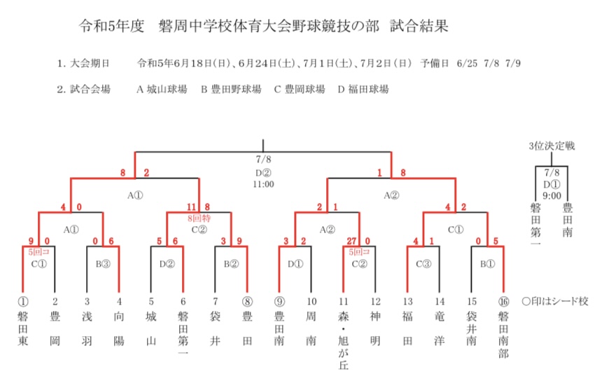 | 11月 3日(金) | 中学新人磐田大会 | 城山球場 | @ | 9:00 | 竜洋 | 対 | 森・旭ヶ丘 | 磐田 | 磐田 | - | 磐田 |