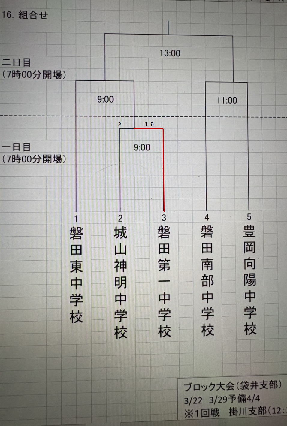 豊田球場 | @ | 9:00 | 城山・神明 | VS | 磐田第一 | 加藤 | 竹下 | ― | 金子 |